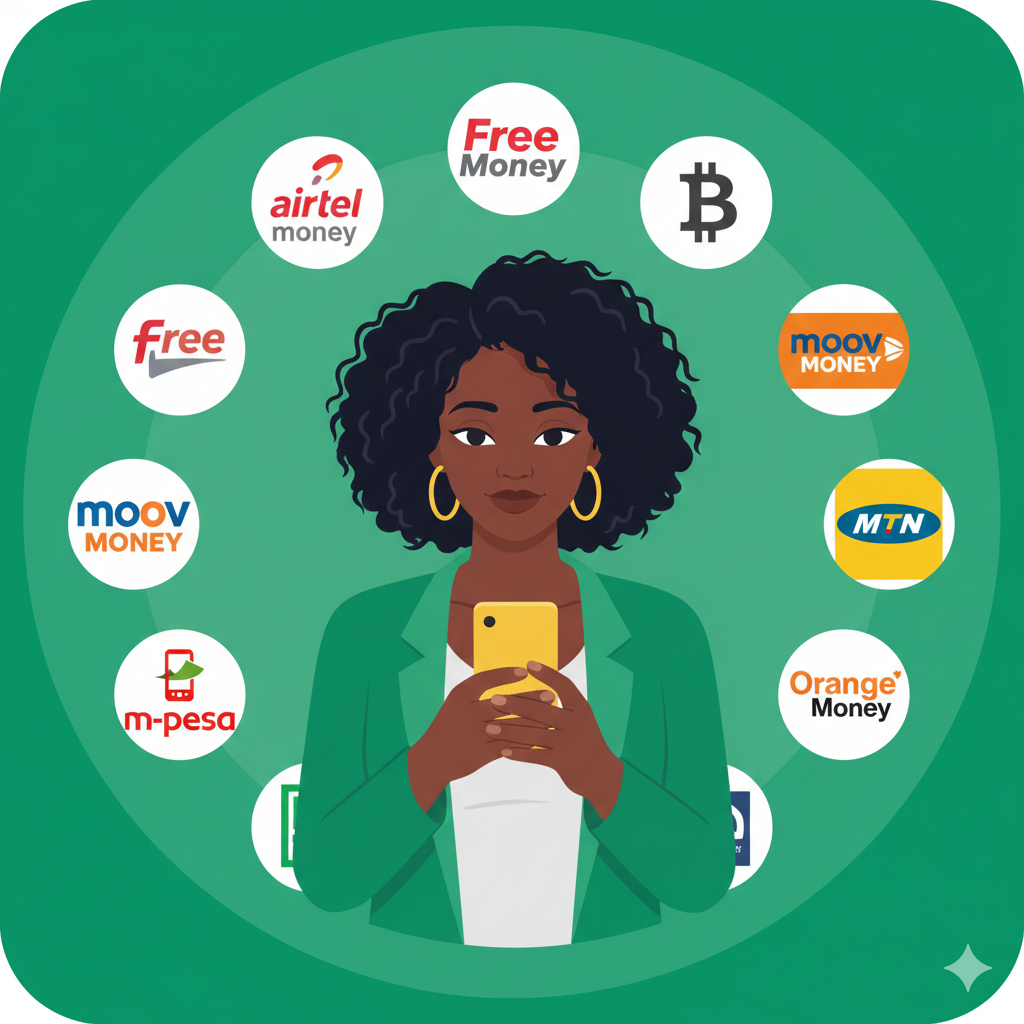 Transformez vos devises locales (XOF, XAF, CDF, USD, NGN, KES, GHS, ZAR…) en crypto ou inversement, en quelques clics et en temps réel.